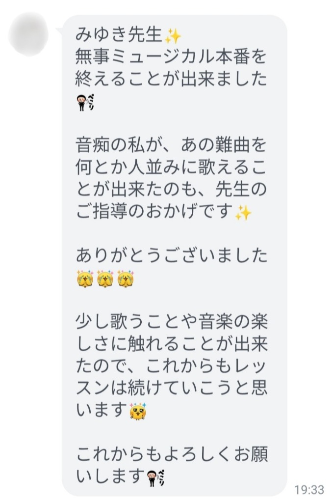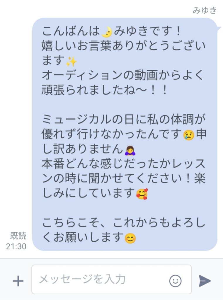 本番を終えた生徒さんから、みゆき先生あてにこんな連絡が届いたよ。
