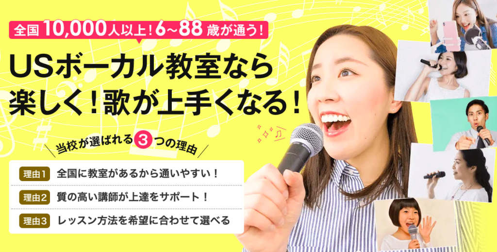 USボーカル教室は、初心者からプロ志望者まで幅広い生徒を対象にしたボイストレーニング教室です。全国に約100校を展開し、岡山にも教室を構えています。